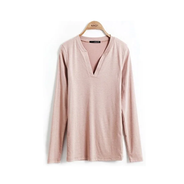 בסיסי V צוואר ארוך שרוול מתאים מישור למעלה Solid Stretch חולצה נשים קוריאנית חולצה ביגוד סתיו Tops Slim T חולצות Harajuku