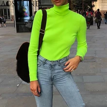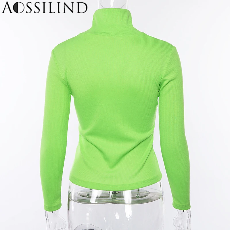 AOSSILIND Turtleneck Long Sleeve Autumn T shirt Women Fluorescent Green Pullovers Winter Slim Streetwear Casual Tshirt Tops