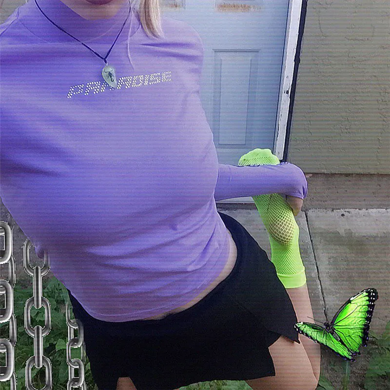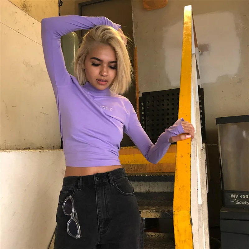 Purple Long Sleeve Tee Shirt Turtleneck Letter Diamonds Women Clothes Crop Top 2018 Autumn Fashion Sexy Tshirts Female Wholesale