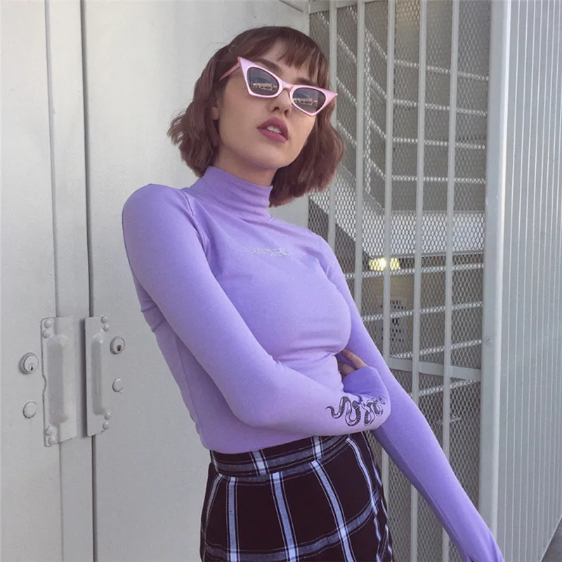 סגול שרוול ארוך טי שירט יהלומים מכתב turtleneck נשים ביגוד לחיתוך למעלה 2018 סתיו אופנה סקסי חולצות נקבה סיטונאות