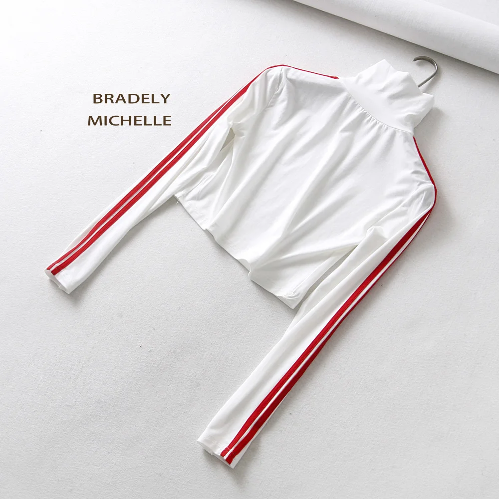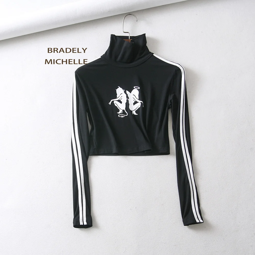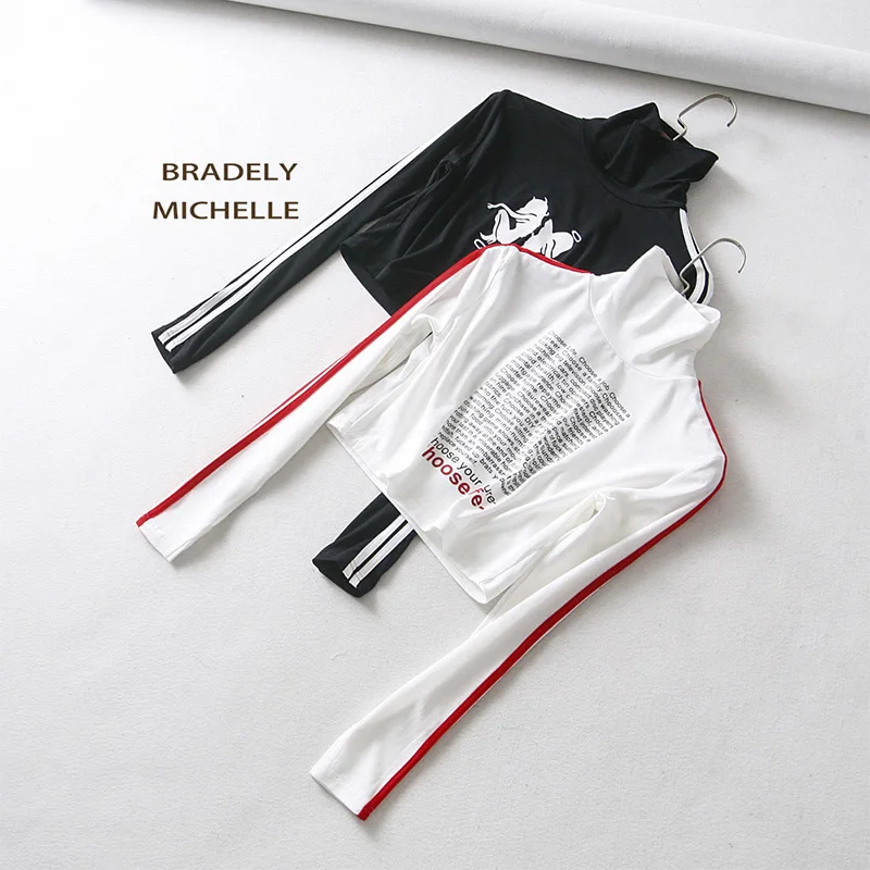 BRADELY MICHELLE 2018 sexy women high neck printed letter T-shirt slim turtleneck long sleeve crop tops side stripped short top