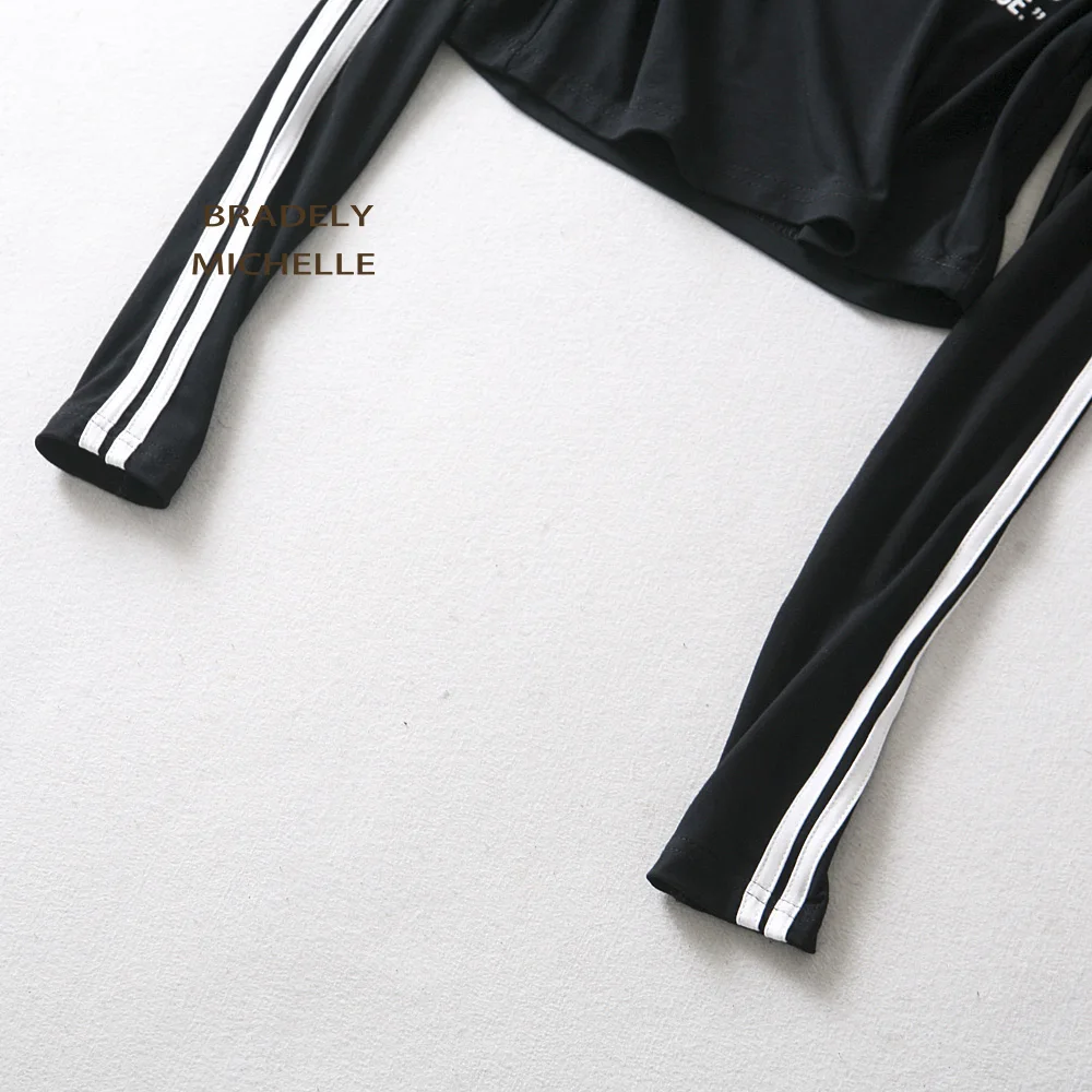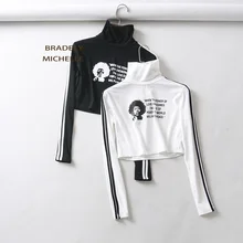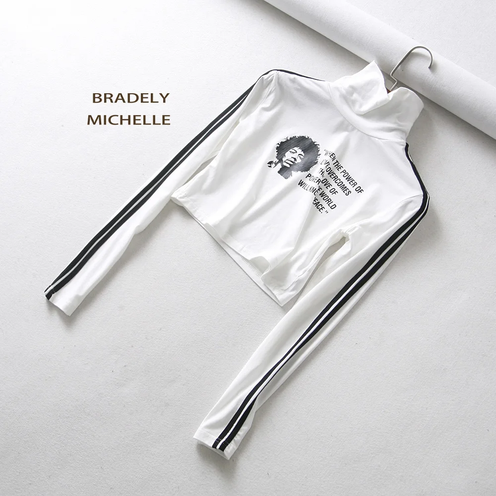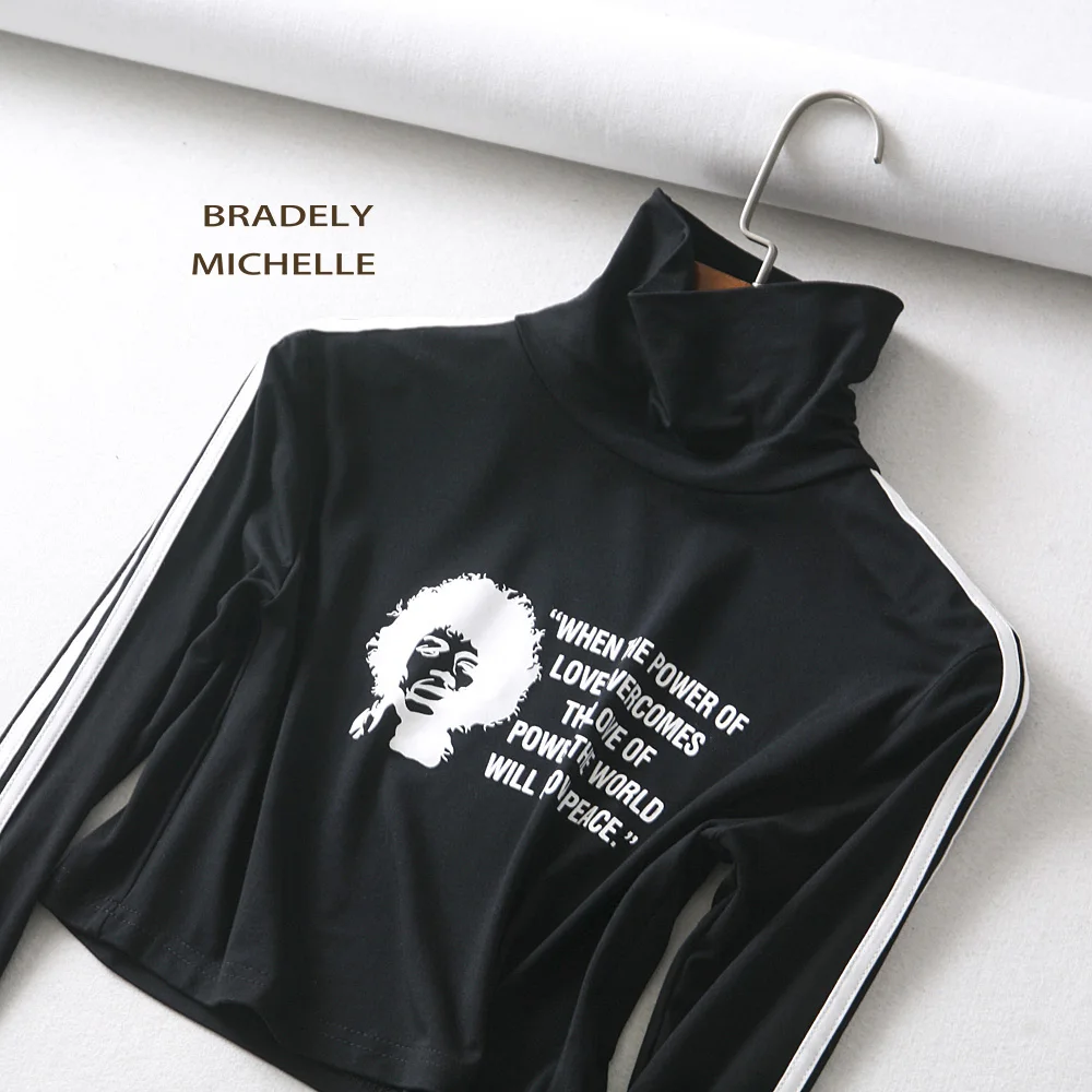 BRADELY MICHELLE sexy women high neck printed letter T-shirt slim long sleeve tops side stripped short top