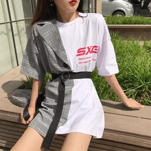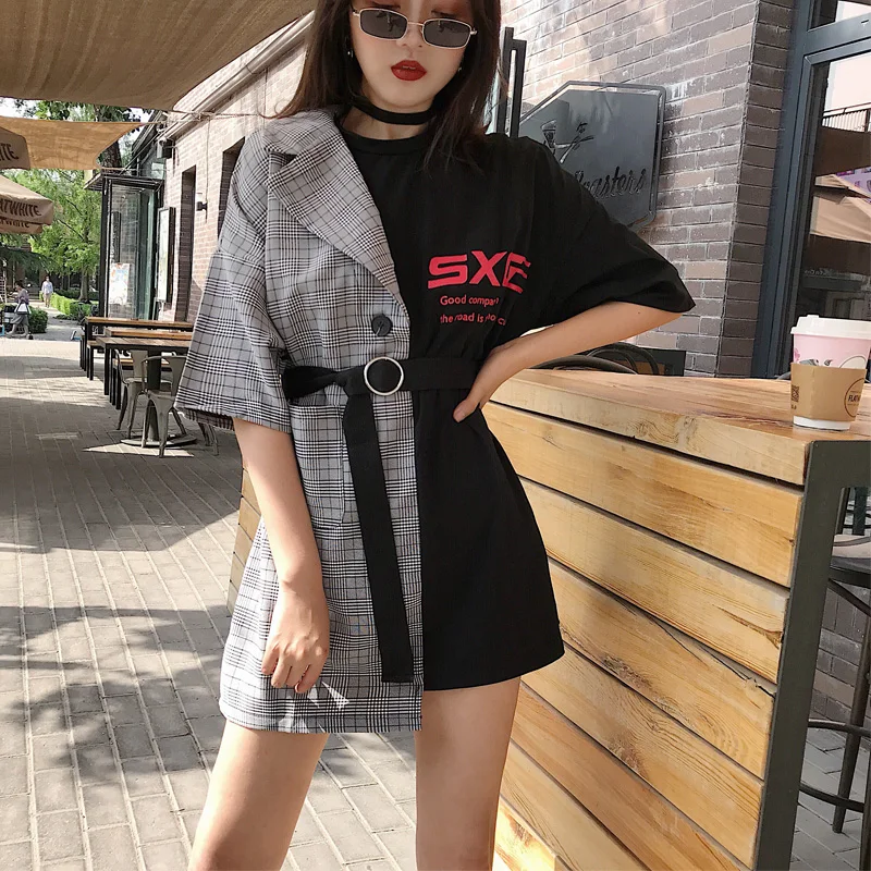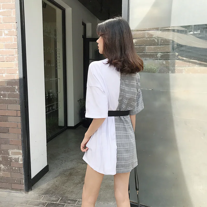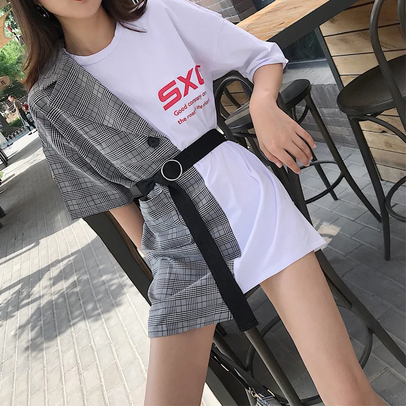 Summer Short Sleeve Solid Color T-shirt Patchwork Plaid Suit Fake Two Pieces The Belt Long Tshirt Female Korean Fashion Clothing