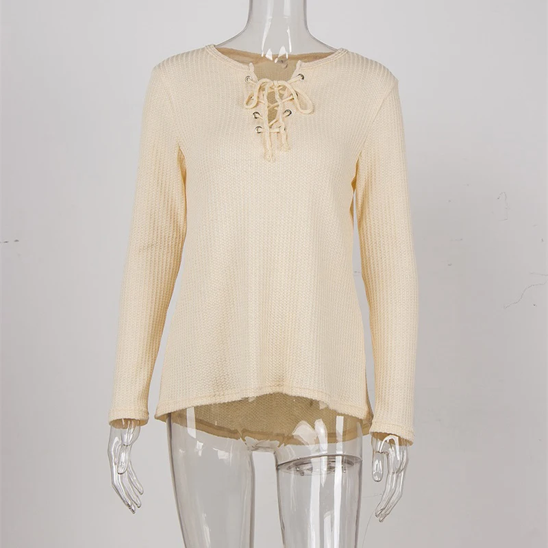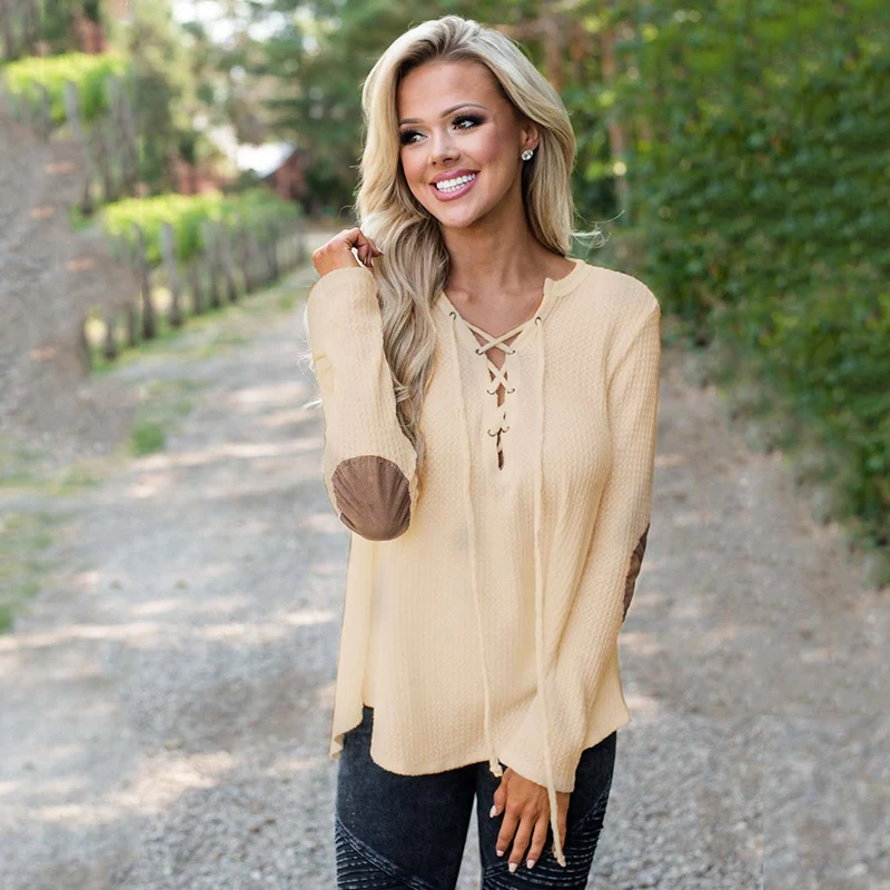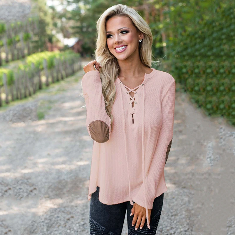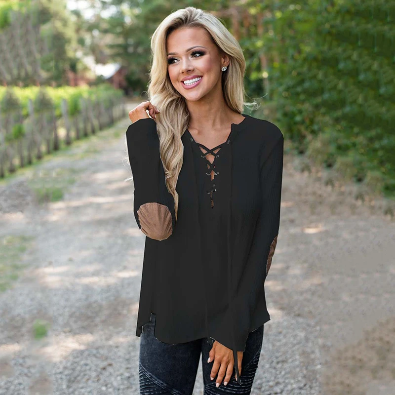 Women Lace up Splicing Tshirt 2018 Spring Autumn V Neck Long Sleeve Top Tees Casual Womens Long T Shirts Black Winter Top