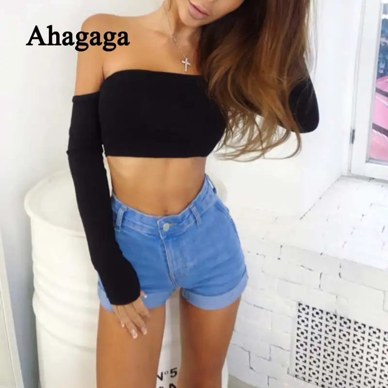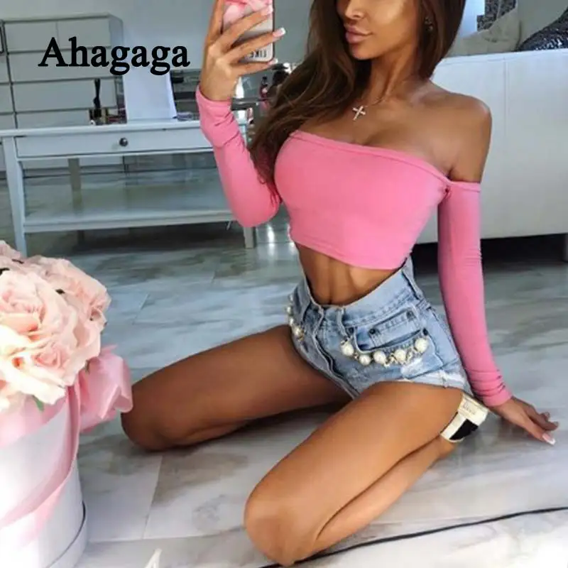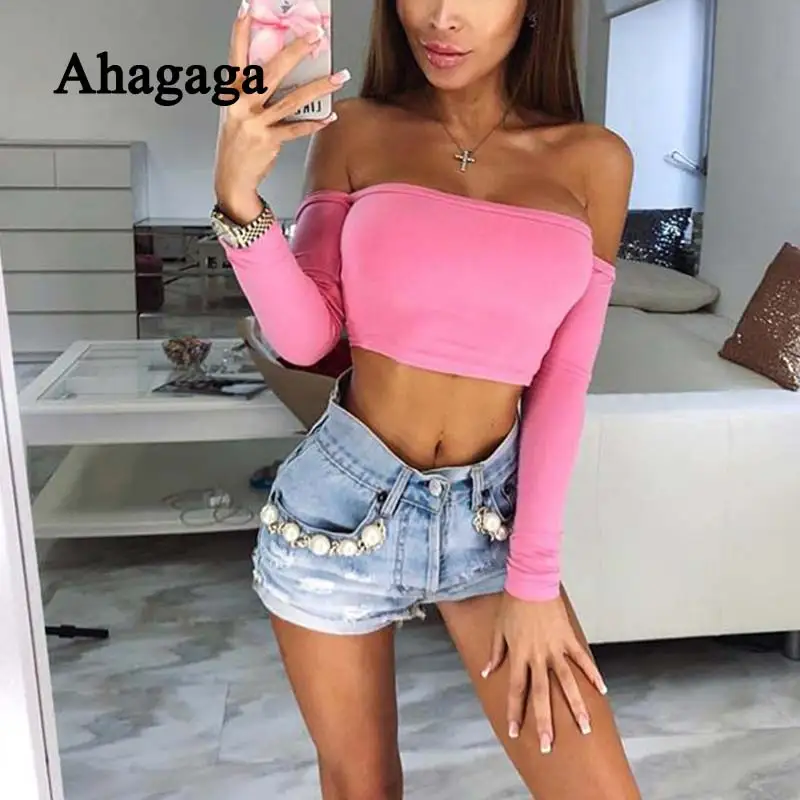 2018 סתיו Tees T Shirt נשים Tops אופנה Solid שרוול ארוך רגיל סלאש צוואר סקסי קצר חולצה חולצות Blusas נקבה