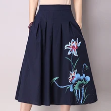 | 2018 בקיץ ובסתיו מקרי רקמת כותנה ופשתן נשים ארוכת חצאית הכחולה עמוק דפס וינטג חצאיות נשים גודל פלוס |